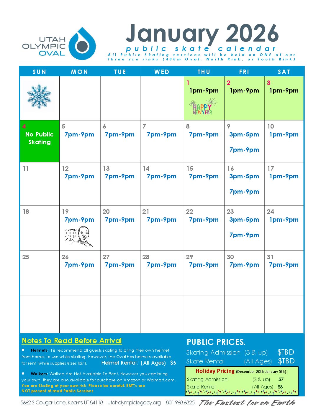 January Public Skate Calendar