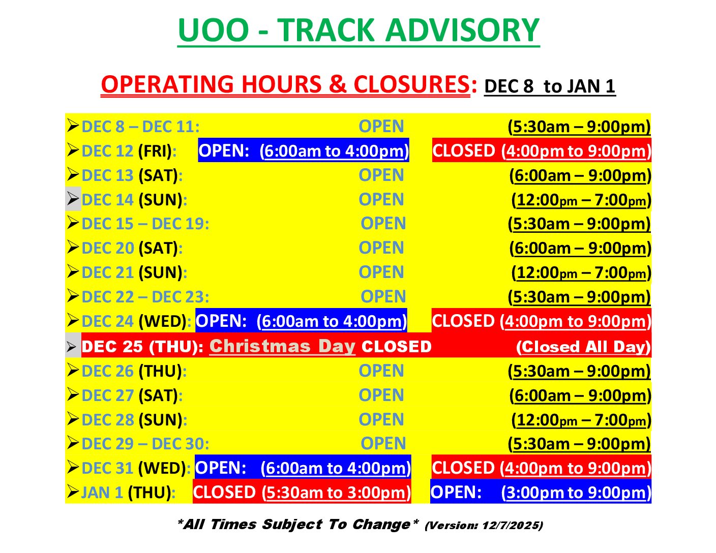 9. Changes to Operating Hours.